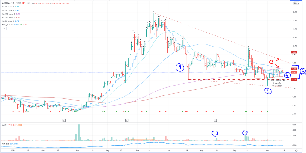 [6] kilka rzeczy na raz: linia trendu spadkowego, spadająca 50 SMA, cena < 150 SMA (choć nadal jest ona rosnąca co jest na +)