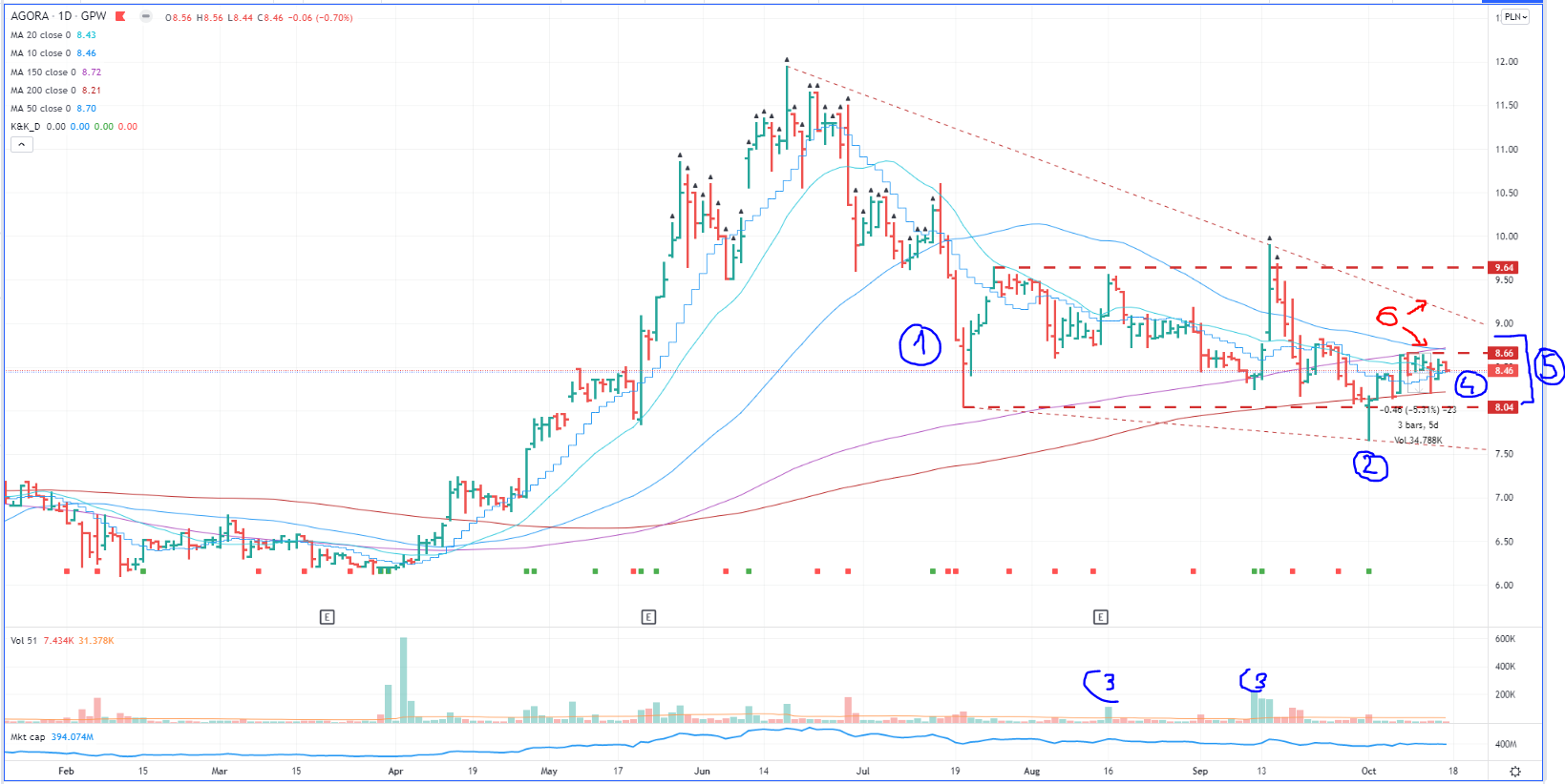 [6] kilka rzeczy na raz: linia trendu spadkowego, spadająca 50 SMA, cena < 150 SMA (choć nadal jest ona rosnąca co jest na +)