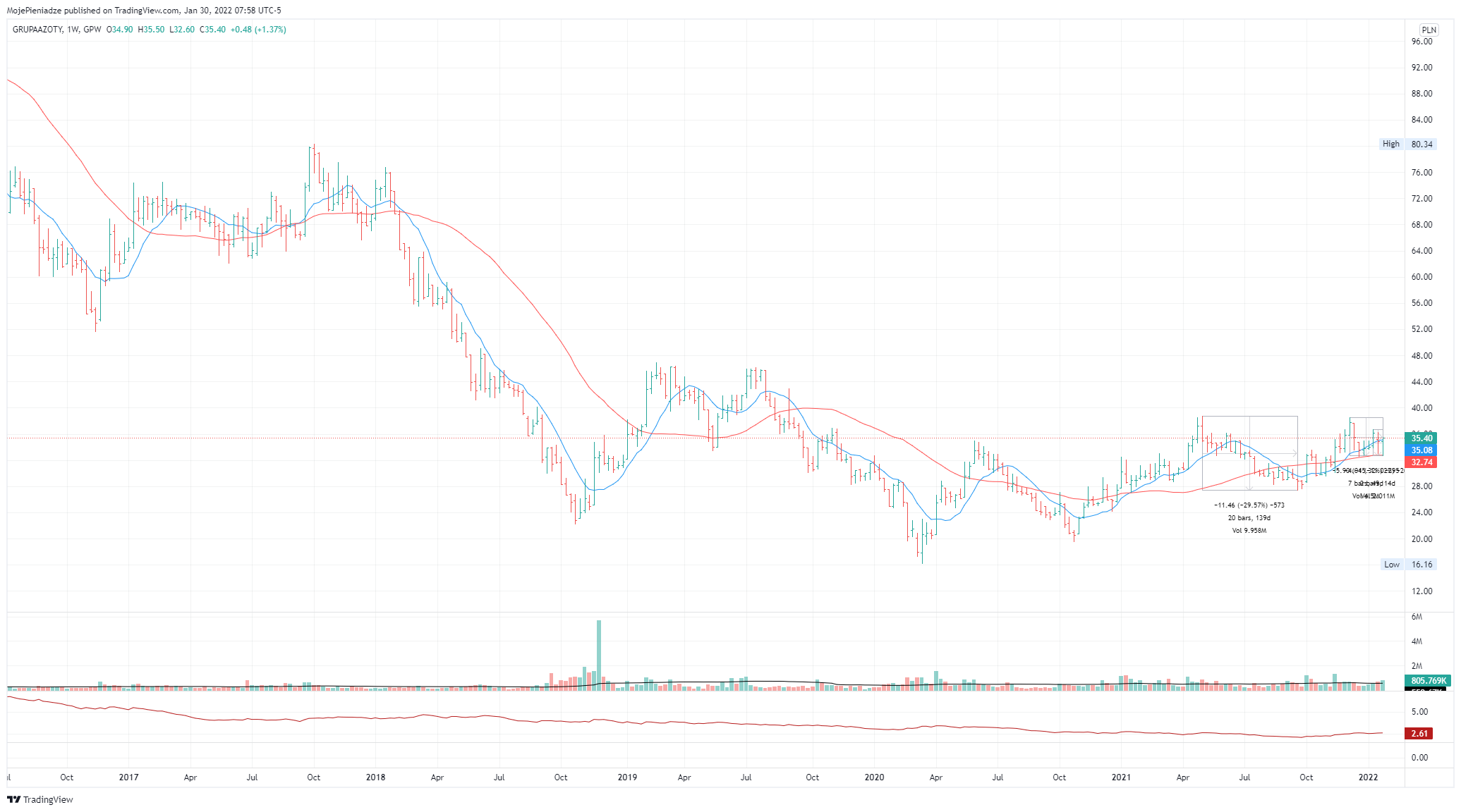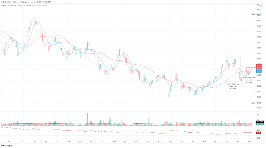 CIE – sytuacja bardzo podobna jeśli chodzi o średnie. Jest jednak jeden pozytyw a mianowicie stosunkowo mały zakres 12% który widzimy na wykresie tygodniowym, który moim zdaniem wygląda lepiej niż ATT. Poniżej wykresy zrówno tygodniowy jak i dzienny.