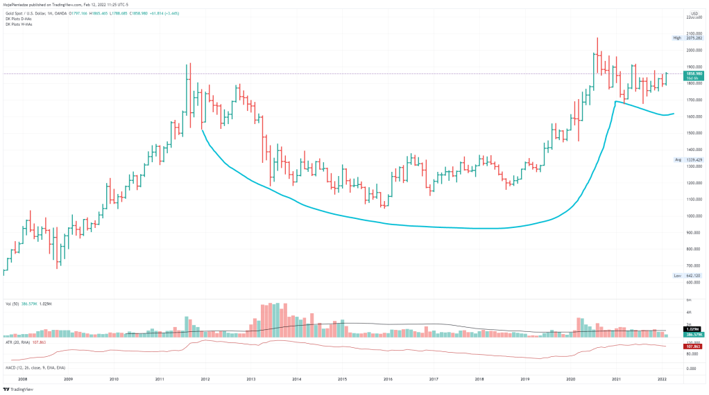 Od czasu ustanowienią maksimum w sierpniu 2020 roku – złoto przemieszczało się w zakresie w trendzie bocznym, korygując od szczytu o maksimum 20%. Spojrzmy jednak na wykres … miesięczny – formacja ogromnego cup&handle sięgająca aż do 2011 roku.