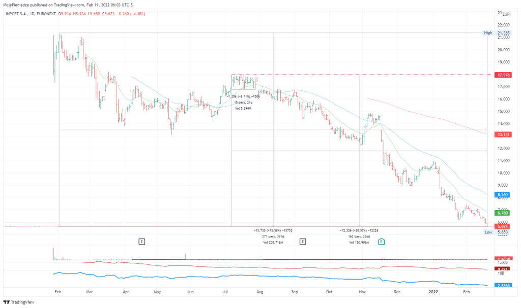 Gdybym wszedł nie czekają na przełamanie poziomu 18EUR – i nadal trzymał (co nie ma prawa się wydarzyć) – obsunięcie kapitału wyniosłoby 68%. Od szczytu sprzed roku spadek wynosi 73%. Jak się czują teraz te osoby które ‚uwierzyły’ w piękne słowa pana Prezesa? (https://www.forbes.pl/przywodztwo/rafal-brzoska-tworca-inpostu-udowodnil-ze-nie-brak-mu-biznesowej-odwagi/35m8h6b)