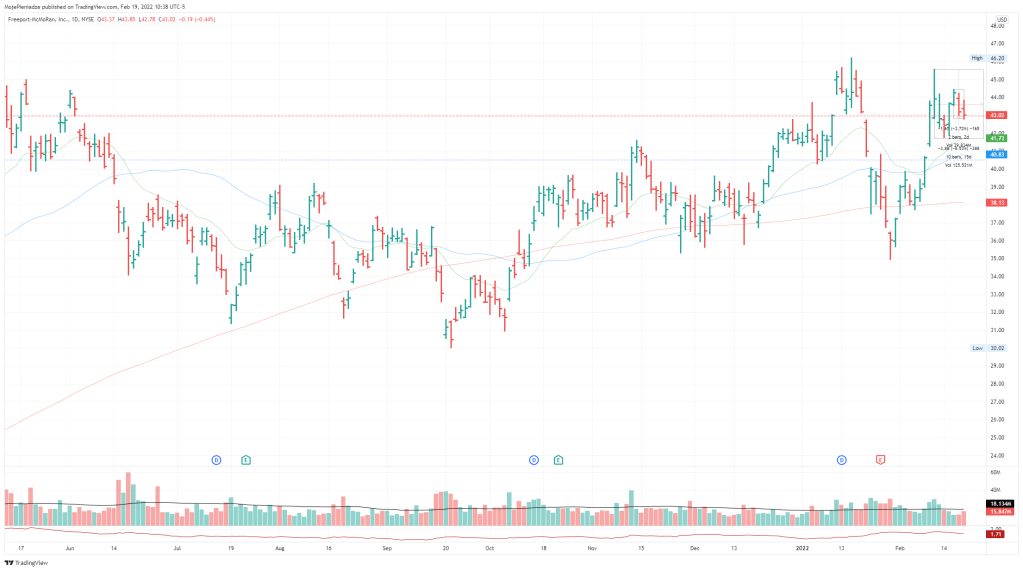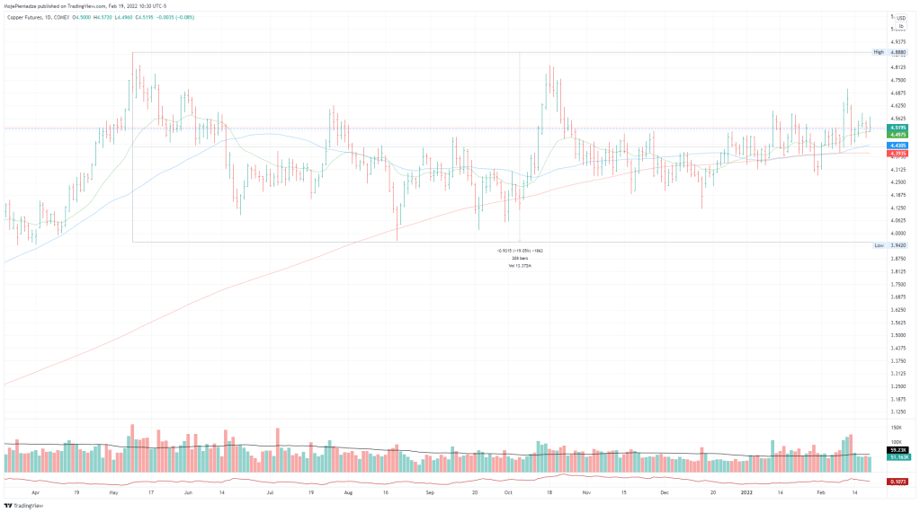 COMEX:HG1! – cena trzyma się blisko szczytów, które są na poziomie szczytów z 2011 roku. Różnica taka że w 2011 był szczyt i ‚zwałka’ a teraz mamy sytuacje trochę inną. Od maja 2021 jesteśmy w trendzie bocznym o maksymalnej korekcie 18%. Kurs jest nadal ponad 200SMA jak i 50SMA. Wykres dzienny (poniżej) jest jednak trochę ‚poszarpany’.