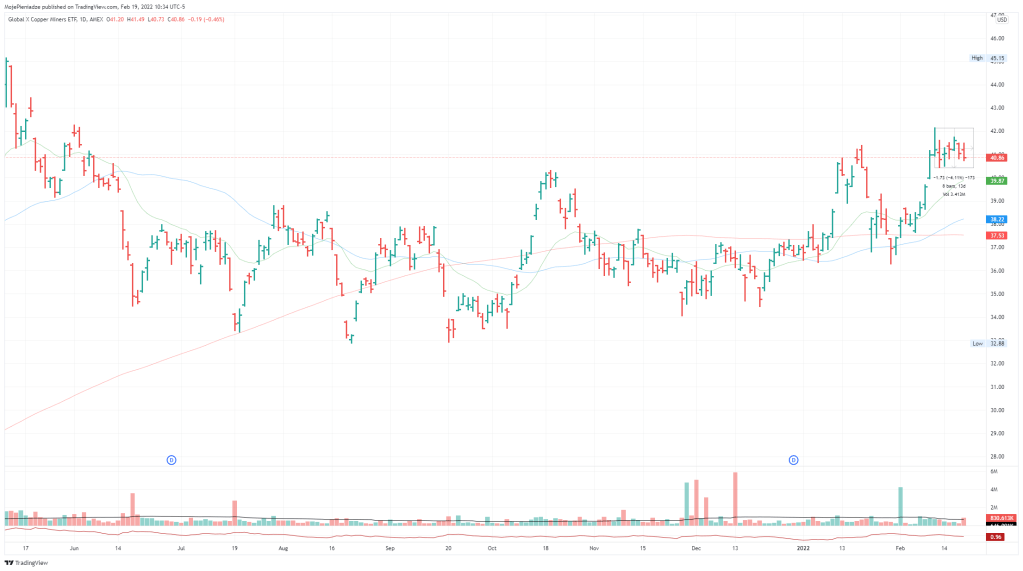 Zacznijmy od COPX (Global X Coppers Miners ETF) – wykres poniżej. Bardzo zachęcające jest to 4% zawężenie ceny widoczne w ostatnich dwóch tygodniach. Wyjście powyżej $42 to sygnał mocy i możliwe wejście na long’a. Technicznie też wygląda to dobrze: