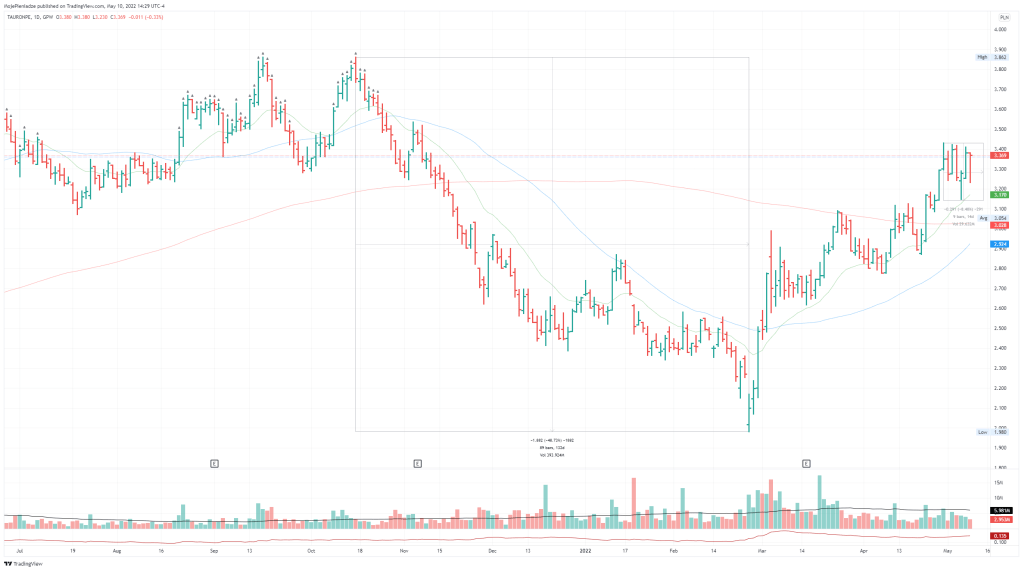 Jedna z niewielu spółek, która pokazuje dobry układ – choć też nie do końca bo brak wszystkich elementów (np. rosnącej 200SMA). Ale … w przekroju całego rynku wygląda w miarę mocno.