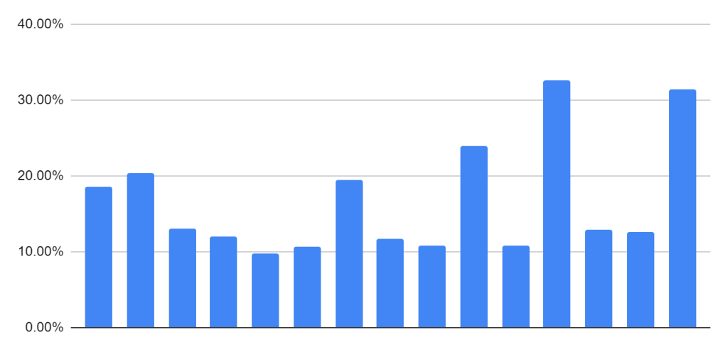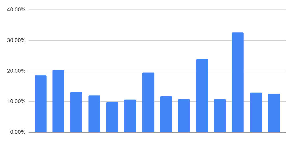 Ta statystyka była szokująca dla mnie … na przestrzeni 12 lat było tylko 14 korekt z czego zaledwie 5 powyżej 15%. To pokazuje skalę QE … nieustanna pompa w górę.