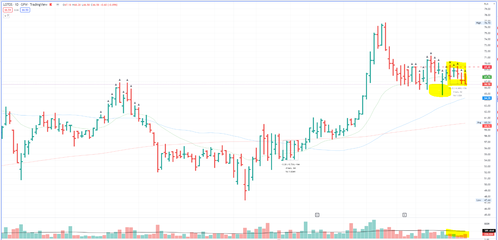 Poprzednia transakcja z 9-12 maja zakończyła się uderzeniem w Stop Loss i stratą 6.6%. Patrząc teraz na wykres można pomyśleć że to był shakeout (świeca która zeszła poniżej ostatniego minimum), którego padłem ‚ofiarą’. Bywa …. wykres nadal jednak pozostaje mocny. Price action jest w miarę wąskie – obroty poniżej średnich. Pozostawiam na liście do dalszej obserwacji z alertem na poziome 69.4PLN.