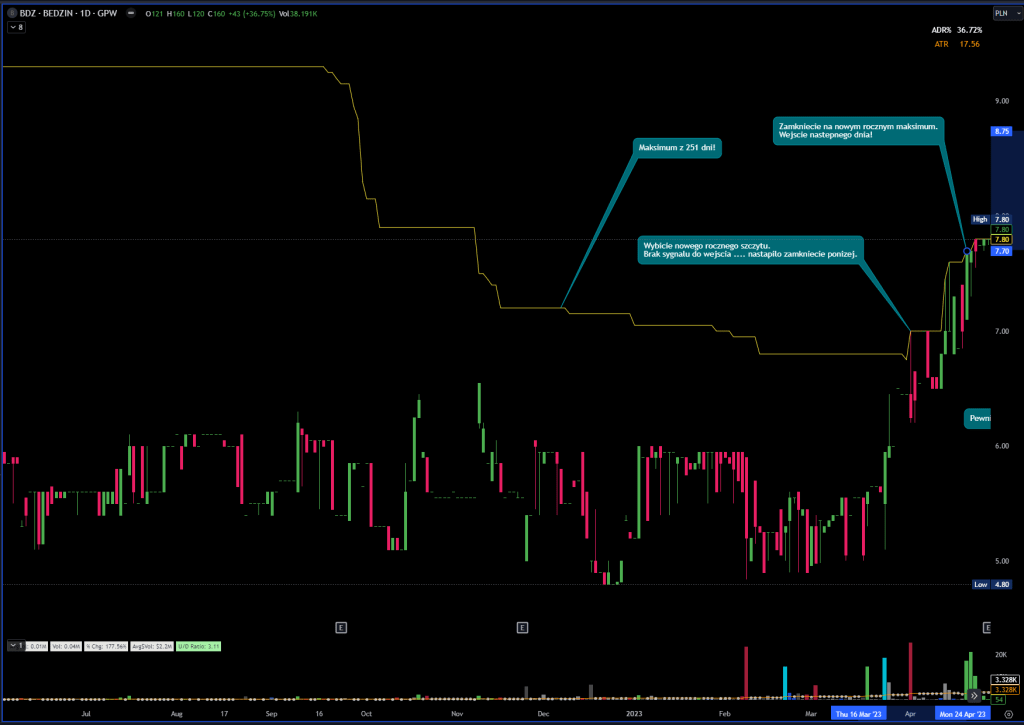 [1] wybicie nowego rocznego maksimum – w tym celu dodajemy nową linię do wykresu …. maksimum z 251 dni (proxy dla calego roku- najprostszy sposób jaki znazłem w TV) …
