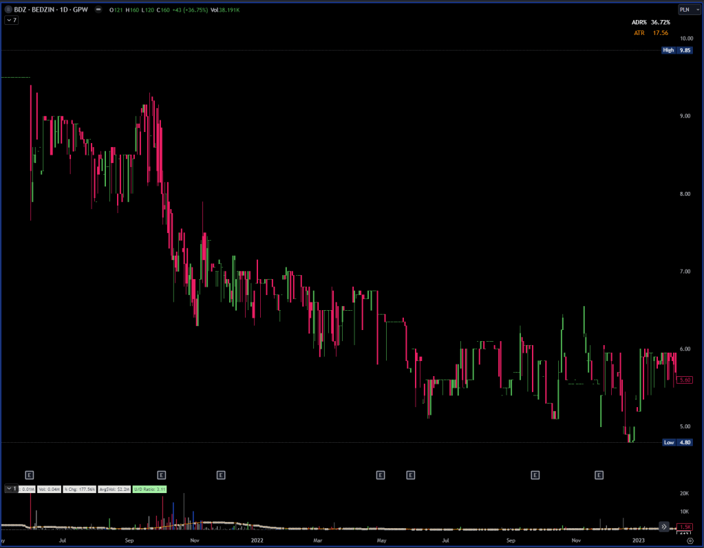 – od tego momentu mieliśmy zjazd w dół aż do 4.8PLN (89%) które zostało ustanowione w grudniu 2022